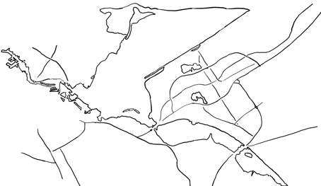 IllustratiesOnderstaande afbeelding werd in stappen opgebouwd. In eerste instantie diende een sateliet foto (Google Earth) als maatvast schaalmodel. Aan de hand van deze afbeelding werden in Photoshop de buitenste lijnen en de belangrijkste water- en autowegen overgetekend.