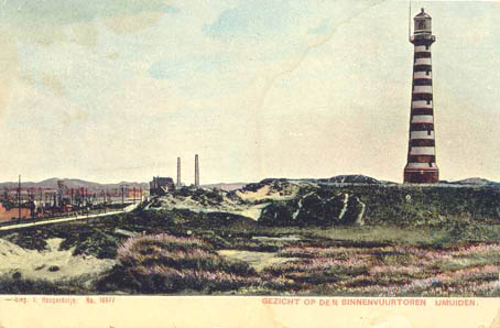 Oer-IJ met bewoning op de hoger gelegen gebieden. © Studio Alfazet Noordzee kanaalSchoolplaat na de aanleg van het Noordzee kanaal. In die tijd was dat een enorme overwinning om zo maar door de veilige duinenrij heen te graven om grotere schepen naar Amsterdam te laten varen. Klik in de kaart voor een vergroting. Prachtig is de duinenrij in beeld gebracht met de twee kenmerkende vuurtorens voor een rechte doorgang door de pieren. Let op de trein over de zuider pier die de basaltblokken aanvoerde. Er zijn weinig aanknopingspunten voor de duinenrij zoals die toen was. Bij de aanleg van het Noordzeekanaal hebben we daar even kijk op. Het werd in 1867 geopend. Er is een roman verschenen over Abraham die de aanleg van de sluizen en de manier waarop er in die tijd moest worden gewerkt aan de kaak stelt. Net zoals met het Noord Hollands kanaal dat daarvoor was aangelegd, werd het al vrij snel duidelijk dat ook deze doorgang niet groot genoeg zou zijn. Het kanaal was (nog) niet breed genoeg en te ondiep, de schutsluis was te klein. Maar daar zou verandering in komen met twee nieuwe schutsluizen en verbreding en uitdieping. En wederom staat de aanleg van nog een nòg grotere sluis (2010 e.v.) op stapel.